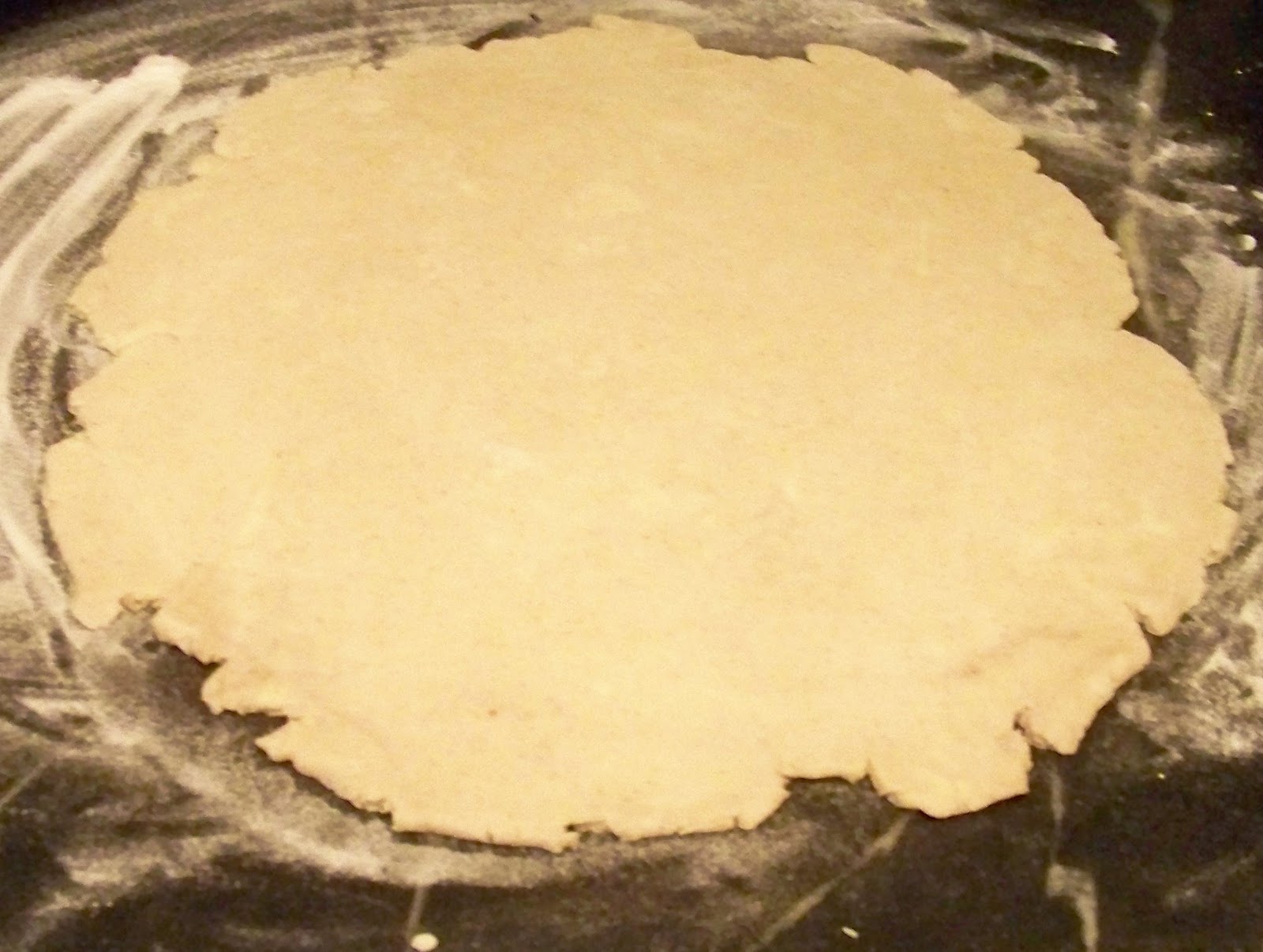 Roll the dough out to a circle an 1/8" thick. Keep turning your dough an 1/8 of a turn with each stroke. This will help to keep your dough even and help it to keep from sticking.